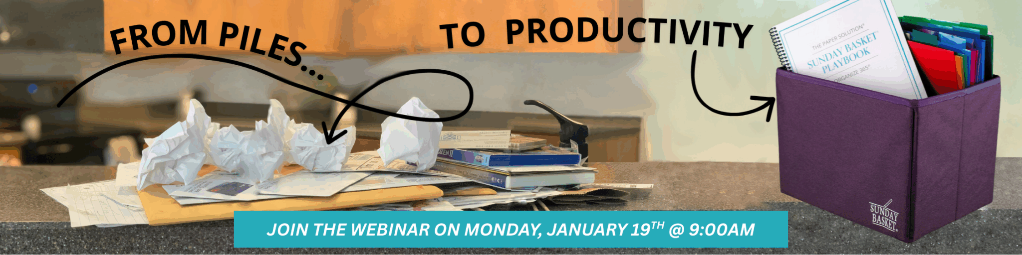 If you’re ready to stop living in a constant state of reactivity and start proactively managing your paper piles, to-dos, and time, the Sunday Basket® is your first step.